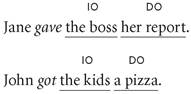 A small but important group of verbs take not one object but two objects. When there are two objects in a sentence, the objects are called the indirect object (IO) and the direct object (DO). (In a sentence with a single object, that object is always a direct object, usually shortened to just “object.” We can only have an indirect object where there is also a direct object.) The two objects occur in a fixed order: the indirect object always precedes the direct object. Here are two examples of sentences with this type of double complement: