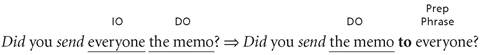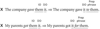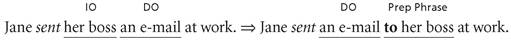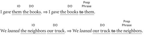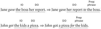 Nearly all complements that have an indirect object + direct object complement have an alternative form that functions as a paraphrase of the original form. We can imagine this paraphrase taking place as a two-step process: (1) the indirect object is turned into a prepositional phrase using to or for, and (2) the direct object is then moved in front of the prepositional phrase. Here are examples of how this to/for paraphrase transforms the original IO + DO complements: