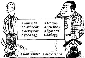 The words man, book, box, egg, rabbit are nouns. The words fat, thin, old, new, heavy, light, good, bad, white, black all tell us something about the meaning of these nouns. They tell us what kind of man, what kind of book, what kind of egg, etc. They are adjectives.
