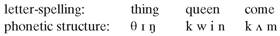 In the process of reading words on a page, we translate visual marks (letters) into mental representations of sounds (phones, or phonemes). English uses a ’phonetic-alphabetic script’ in which letters stand for sounds, or serve to represent particular patterns of sound. For example, the letter ’p’ in ’pin’ stands for a single sound (which we write phonetically as [p]); the two letters ’th’ in ’thin’ stand for a single sound (which we write phonetically as [0]); the letter ’i’ in ’time’ stands for a combination of sounds called a diphthong (which we write phonetically as [a i]). We can represent the way a word is made up of sounds using a phonetic script, and so can compare the letter-spelling of a word with the phonetic structure of the word: