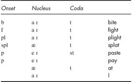In Unit 17 we will see that the metrical form of a poem involves control over the syllables of the line, and syllables are also relevant for the organization of sound patterning. Rhyme and alliteration, the two basic kinds of sound patterning, involve different parts of the syllable. A syllable is divided into three parts (of which only the nucleus is essential): the onset, the nucleus and the coda. Table 16.1 illustrates this division of the syllable into three parts, using monosyllabic words.