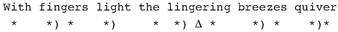 This line also illustrates a second way in which a syllable can be ’extra’. The word ’lingering’ has three syllables but here it counts as two; this means that one syllable is ignored when grouping them into metrical feet. It is possible to mark out these ’ignored’ syllables (while remembering that they do not affect the actual foot size) by writing a different kind of symbol beneath them (we use a delta, a little triangle, to mark uncounted syllables):
